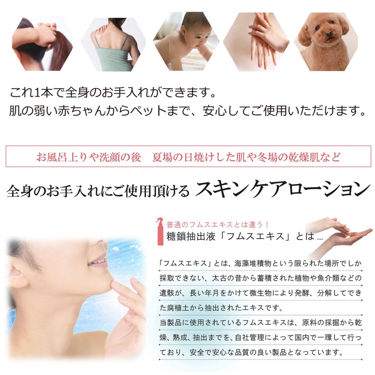 お風呂あがりや洗顔の後、夏場の日焼けした肌や冬場の乾燥肌など、全身のお手入れにご使用いただけるスキンケアローションです。